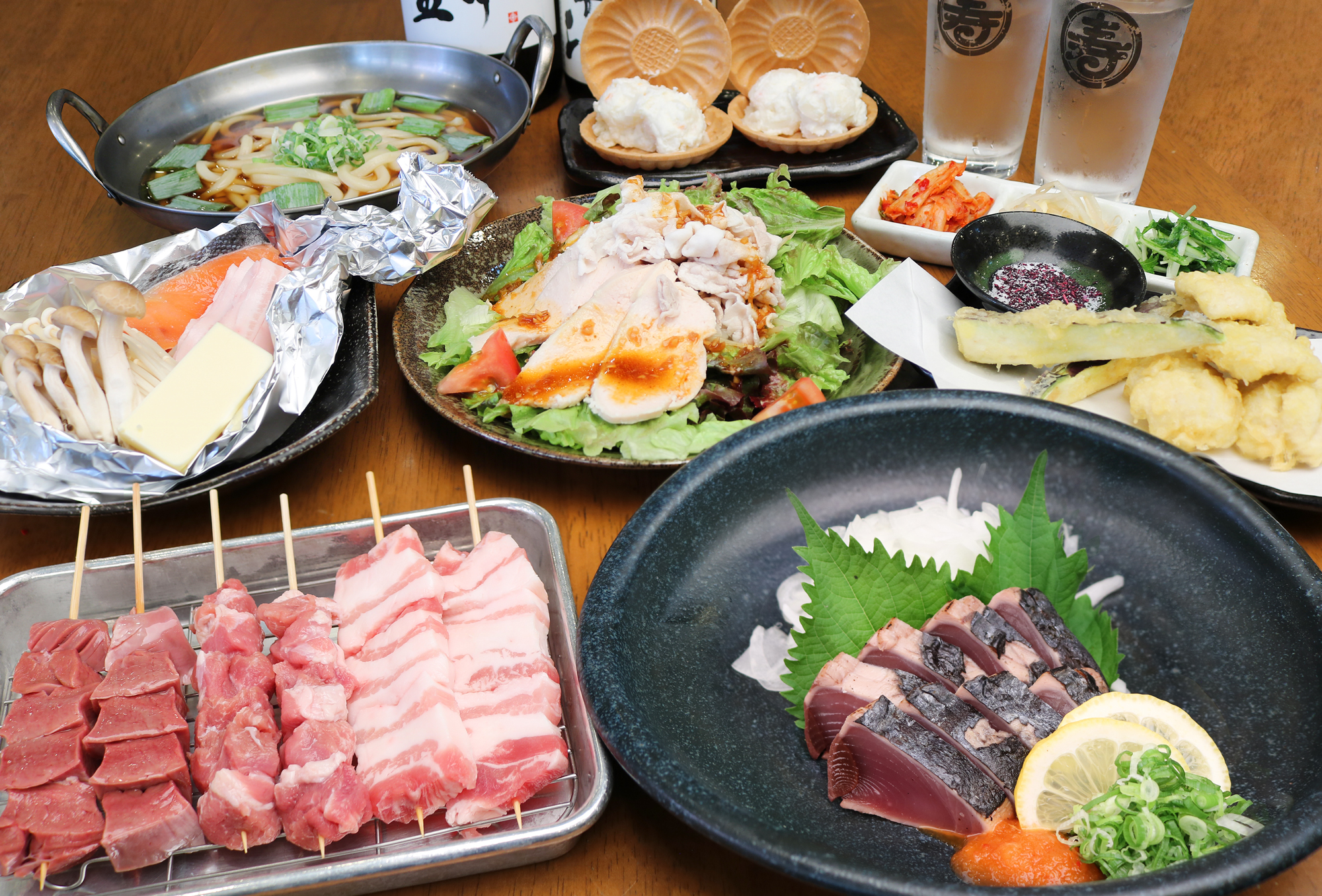 焼物:海鮮と豚バラホイル焼き/やきとん串3種